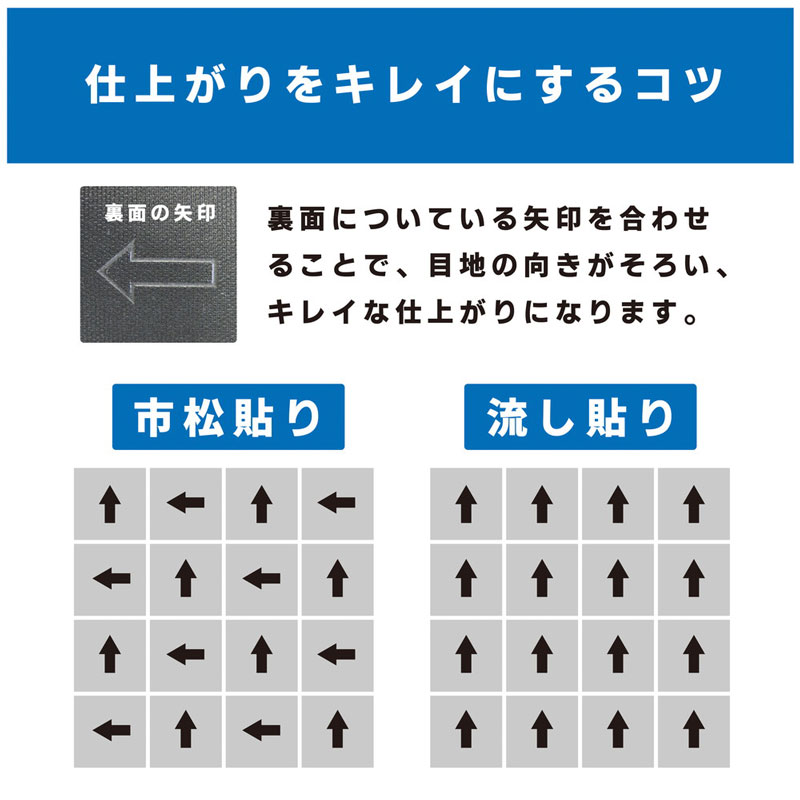 ※裏面は滑り止め加工ではございません。 ※敷き詰めた場合はズレにくくなりますが、基本的には接着剤施工をお薦めいたします。 ※接着剤を使用しない場合は床用両面テープ、またはスベリ止めシートなどをご活用ください。 ※接着剤を使用する場合はピールアップの接着剤をご利用ください。 |