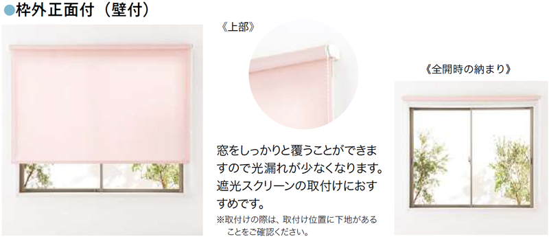 窓枠の外側に設置する場合はこちら。窓枠の上部の縁、または上部壁に取り付けるので正面付けです。