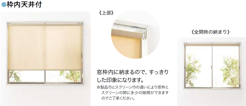 部屋の内側に製品が出っ張ってくるのが気になる場合、窓枠内に製品を納めた方が(天井付けの方が)スッキリ納まります。幅・高さとも窓枠の内側寸法から1㎝ほど引いてください。