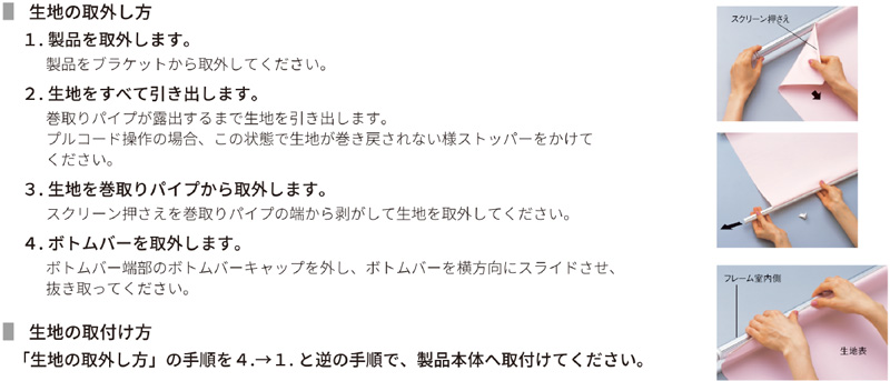 ※ この製品は屋内用です。屋外では使用できません。 ※ 製品重量に耐えられる下地に取付けてください。 ※ 付属のビスは木部用です。木部以外には使用できませんので、木部以外への取付けは専用のネジ、アンカー等をご用意ください。 ※ 本体取付け時には、取付けブラケットに本体が確実に固定されていることを確認してください。確実に固定されていないと製品が落下することがあります。 ※ 浴室湿気の多い場所では使用しないでください。 ※ ロールスクリーンは、厳正なる品質管理および検査を経てお届けしております。お買い上げ後は、取扱説明書をよくお読みの上、正しくご使用くださいますようお願い致します。 |