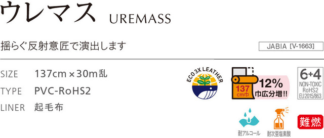品 名 : ウレマス サイズ : 137cm × 30m乱 TYPE : PVC-RoHS2 LINER : 起毛布