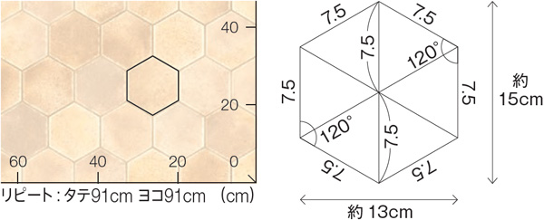 品 種 : クッションフロア KS サイズ : 1820mm 2.3mm リピート : タテ91cm ヨコ91cm 一辺:約7.5cm 一柄:約15cm × 13cm 高耐久UV樹脂コーディング