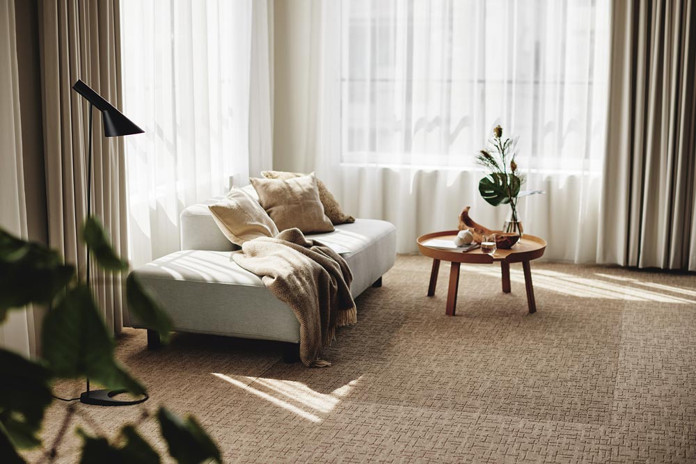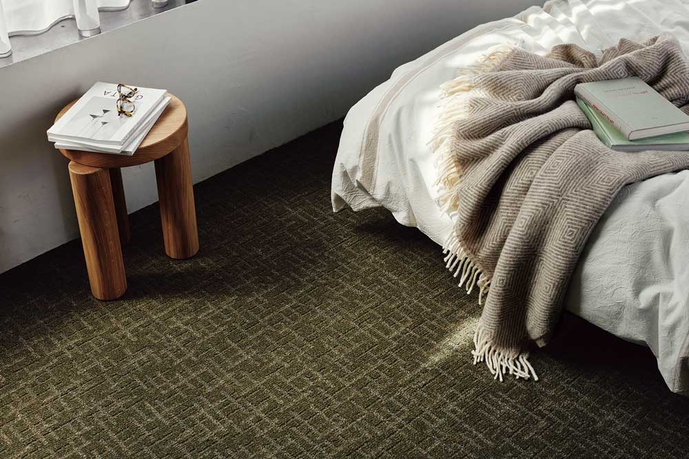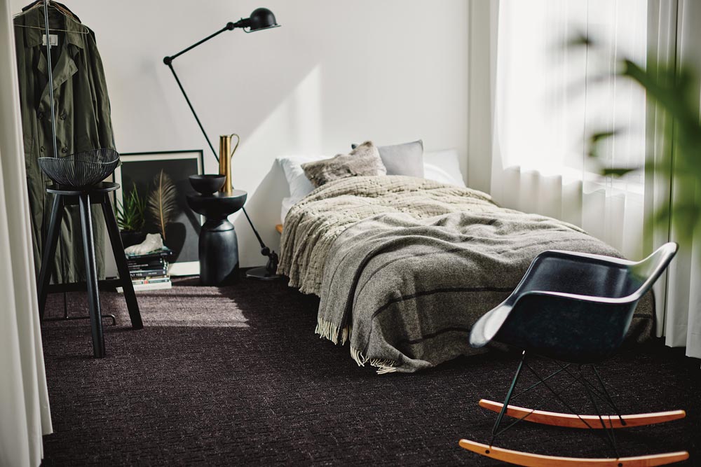 カットパイルと目の詰まったループパイルによる、表情豊かなテクスチャー。さりげなく散りばめられた光沢糸が、星屑のように繊細に煌めく。モダンでシックな印象のカラーで、品格のある空間を演出します。