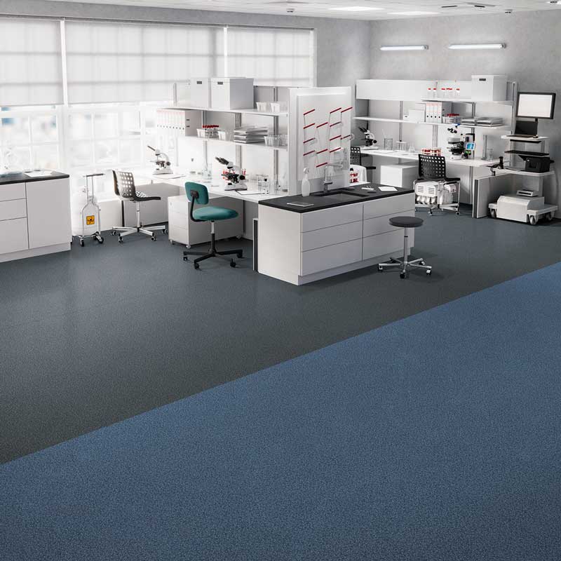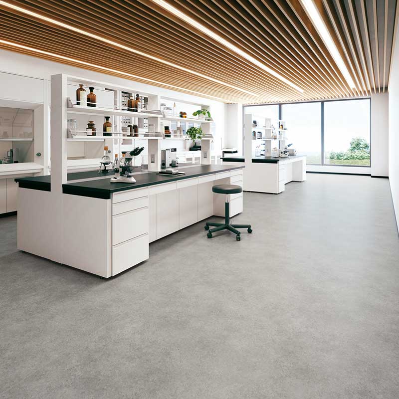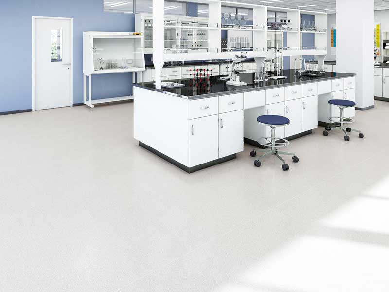 優れた耐薬品性、帯電防止性、耐動荷重性に高いデザイン性が加わった、理科室や実験室、医療施設向けの高機能ノーワックスビニル床シート。