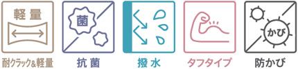 耐クラック&軽量 / 抗菌 / 撥水 / タフタイプ / 防かび 機能性について(PDF ) |
