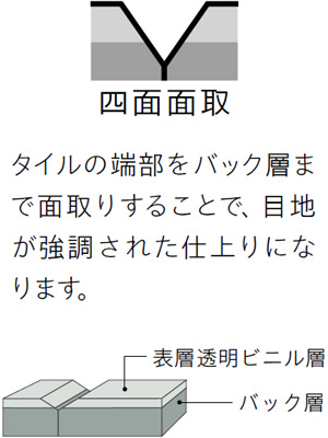 ※ タイル間での柄合わせはできません。 ● 若干寸法にバラツキがあります。施工の際には、ご注意ください。 ● タイル一枚一枚の色柄に変化と濃淡があります。この不均一感が、仕上がったフロアにより一層の自然感をもたらします。 メンテナンス ● 施工後、養生期間をおいてから洗浄剤でポリッシャー洗浄し、よくすすいだ後に樹脂ワックス(ニューFBワックス・Uワックス・ツヤノンワックス(抗菌))を塗布してください。 ● 特に初期メンテナンスでは、タイル表面を充分に洗浄した後ワックスを塗布してください。 ● 状況に応じて、固く絞ったモップでの水拭きによる1日の清掃回数を増やすなど、日常のメンテナンスにご留意ください。 |