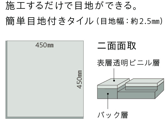サイズ : 450㎜ × 450㎜ 全 厚 : 3.0㎜厚 表層透明ビニル層0.3㎜ 14枚入 / 2.83㎡ / ケース