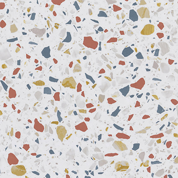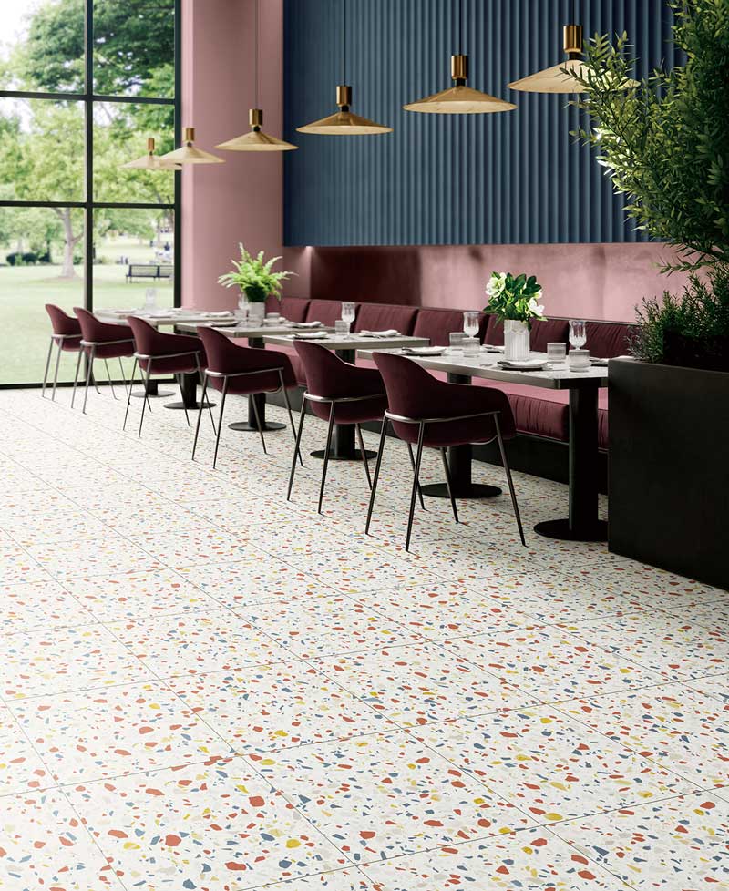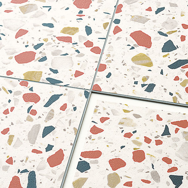 カラフルなマルチカラーテラゾー。ポップな色彩が空間を鮮やかに彩り、楽しげな空間を演出。 施工するだけで目地ができる。簡単目地付きタイル(目地幅:約2.5㎜)