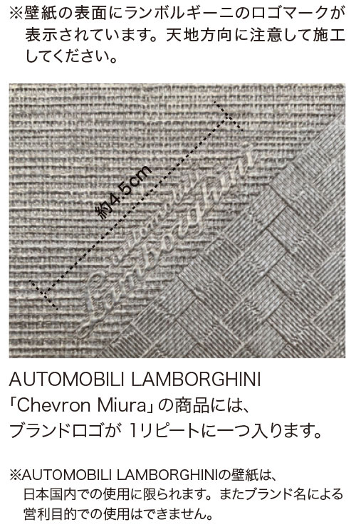 ※ 壁紙の表面にランボルギーニのロゴマークが表示されています。 天地方向に注意して施工してください。 AUTOMOBILI LAMBORGHINIの壁紙は、日本国内での使用に限られます。 またブランド名による営利目的での使用はできません。 |