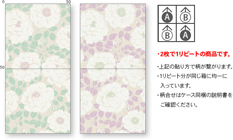 ・ 2枚で1リピート(1柄)の商品です。 ・ 上記の貼り方で柄が繋がります。 ・ 1リピート分が同じ箱に均一に入っています。 ・ 柄合せはケース同梱の説明書をご確認ください。 ※ カットパイルはパイルの方向や傾斜により色差が生じます。 ※ 貼り方については各商品毎の工法をご確認ください。 ※ 柄や色によっては目地が目立つことがあります。 ※ 長期保管の場合、変色が見られる場合があります。 ※ 接着剤のご案内はページ下部にございます。 |