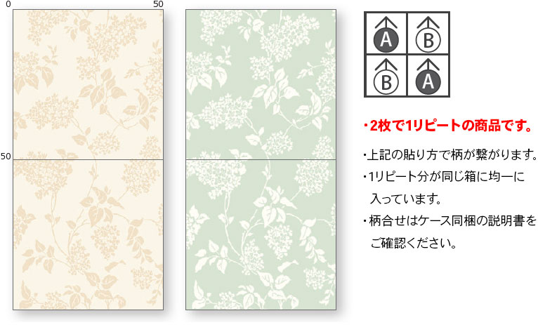 ・ 2枚で1リピート(1柄)の商品です。 ・ 上記の貼り方で柄が繋がります。 ・ 1リピート分が同じ箱に均一に入っています。 ・ 柄合せはケース同梱の説明書をご確認ください。 ※ カットパイルはパイルの方向や傾斜により色差が生じます。 ※ 貼り方については各商品毎の工法をご確認ください。 ※ 柄や色によっては目地が目立つことがあります。 ※ 長期保管の場合、変色が見られる場合があります。 ※ 接着剤のご案内はページ下部にございます。 |
