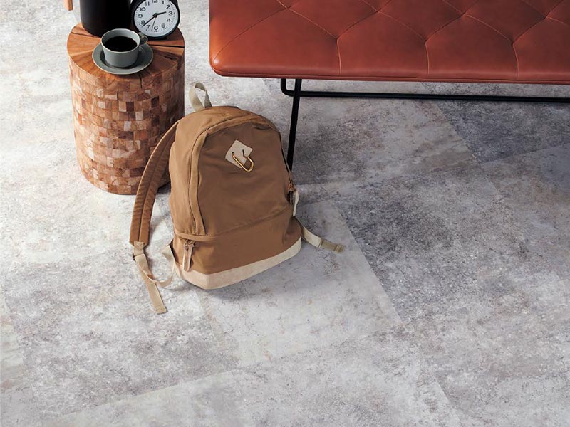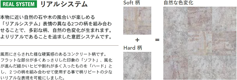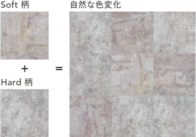 風雨にさらされた様な硬質感のあるコンクリート柄です。 フラットな部分が多くあっさりした印象の「ソフト」、風化が進んだ細かいヒビや割れが多く入ったものを「ハード」とし、2つの柄を組み合わせて使用する事で柄リピートの少ないリアルな表現を可能にしました。