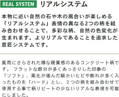 Soft: 硬質感のあるラフなコンクリート。 平滑に整った柄の部位が多い。