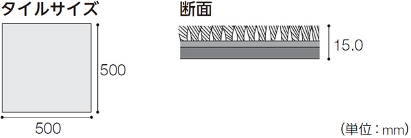 サイズ : 500 × 500mm 全 厚 : 15.0mm パイル形状 : カットパイル パイル長 : 12.0mm パイル密度 : 1/8ゲージ × 11.5ステッチ パイル組成 : ナイロンF100% バッキング : 特殊PVC+ガラス不織布(軽量化バッキング) 重 量 : 14.7kg / ケース 梱 包 : 8枚入 / ケース |