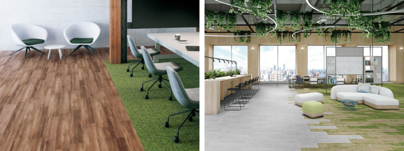 木目や石目の置き敷きフロアタイルとタイルカーペットを組み合わせることで、エリア分けもしながらデザイン性の高い今どきなオシャレオフィスがつくれます。
