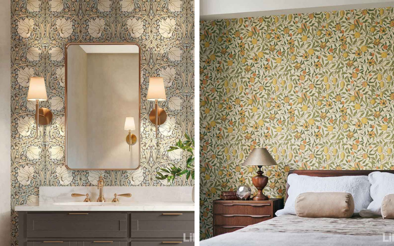 クラシックで華やかなウイリアムモリスのデザインの壁紙を寝室やお手洗いのアクセントとして取り入れてみてはいかがですか。