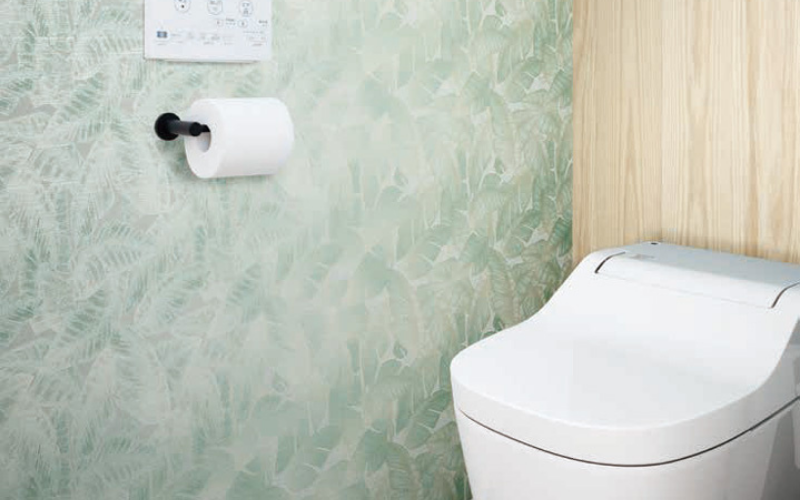 トイレにはナチュラルな木目や草木などのボタニカルな柄の壁紙も人気。