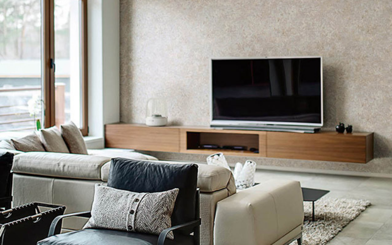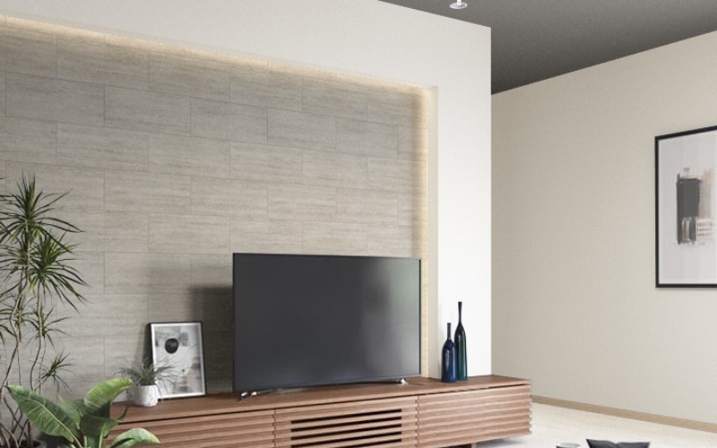 テレビ背面にアクセントクロスを貼ると自然と視線が集まり、部屋全体が引き締まって見えます。