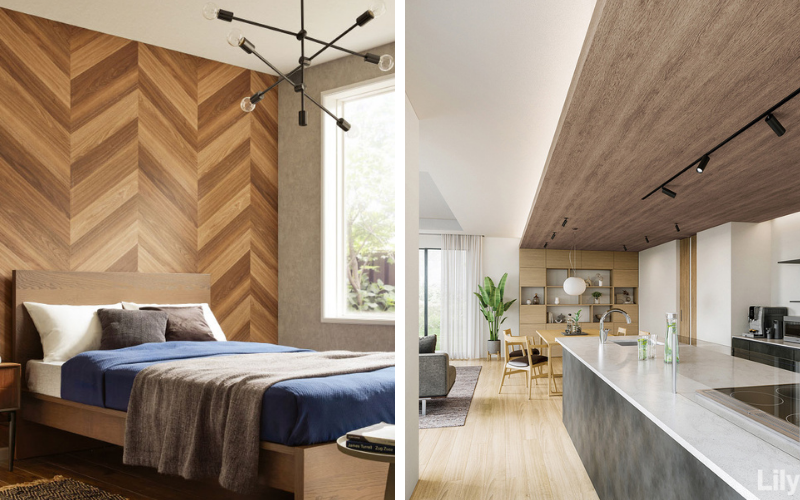 木目柄クロスを天井や壁の一面に取り入れるとナチュラルテイストだけでなくオシャレ感もアップします。