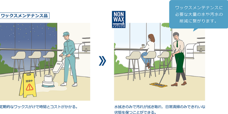 また最近はワックス不要のタイプの種類が増え、このノーワックスタイプを選べばワックスメンテナンスも省けて日ごろのお掃除だけで綺麗な状態をキープすることができます。