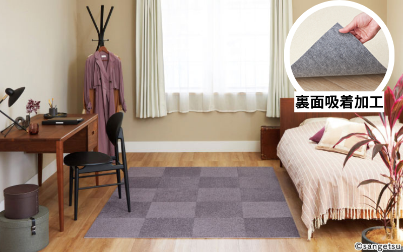 置くだけのタイルカーペットは、裏面に吸着加工が施されているため、接着剤を使わずフローリングに並べて置くだけでオッケーです。