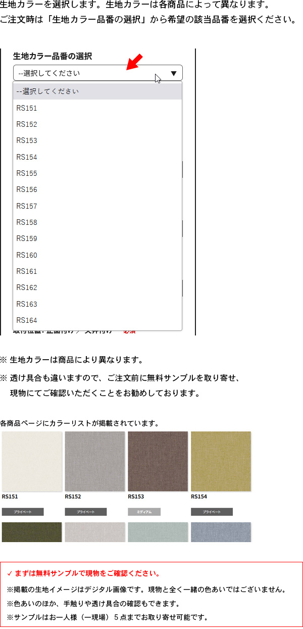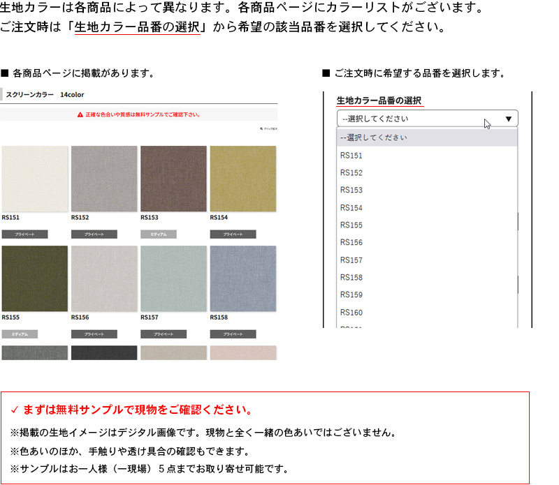 スクリーン生地の現物サンプルがご注文いただけます。色合いの確認や手触り、透け具合などの確認にぜひご利用ください。