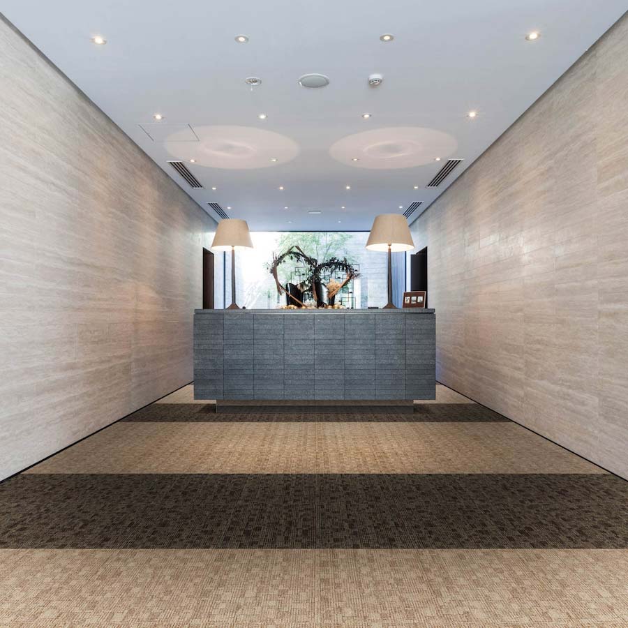 GXシリーズはデザイン性が高くホテルや旅館などの宿泊施設から各種商業施設、オフィスなどに人気のタイルカーペットです。 ほとんどが重歩行タイプ(※)、撥水防汚加工のため人や物の往来が多い場所、空港やショッピングモール、アミューズメント施設などにもご使用いただけます。 また環境配慮型商品となっていますので学校などの教育関連施設にもおすすめです。