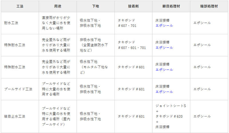 タキボンド#607(耐水工法) タキボンド#601(特殊耐水工法) タキシール#600 (端部処理剤)、溶接棒 |