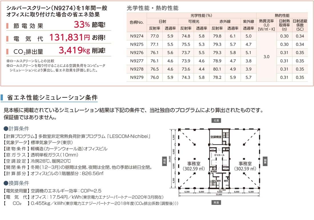 裏面にアルミ蒸着加工を施すことで、眺望性を確保しつつ、非常に高い遮熱性能を持ったロールスクリーンです。 遮熱で空調負荷を軽減、省エネ効果が期待できます。生地はシースルーなので透け感が良く、陽ざしの明るさも確保できます。さらに紫外線をカットするUVカット付き。