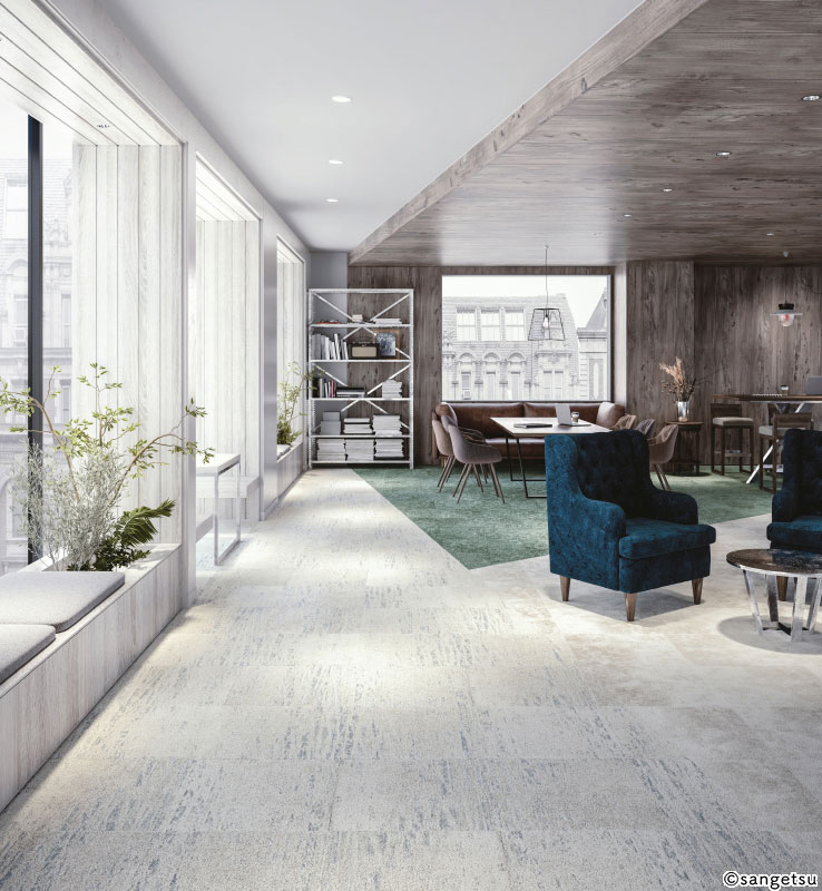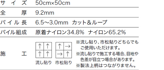 ※ 大柄を50cm角に裁断していますので、タイル毎に柄が異なります。(特定の柄は指定できません) ※ カット部分はパイルの方向や傾斜により色差が生じます。 ※ 貼り方により仕上がりの印象が大きく変わることがあります。 ※ 流し貼りで施工する場合、目地や色差が目立つ場合があります。 ※ 製法上柄はつながりません。 ↓ 資料の「選択・施工上のご注意」を必ずご確認ください。 |