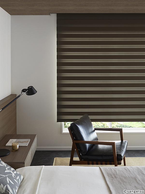 遮光生地の調光ロールスクリーン。前後のスクリーン生地の位置を調整することで遮光機能が得られますので、寝室にもおすすめです。