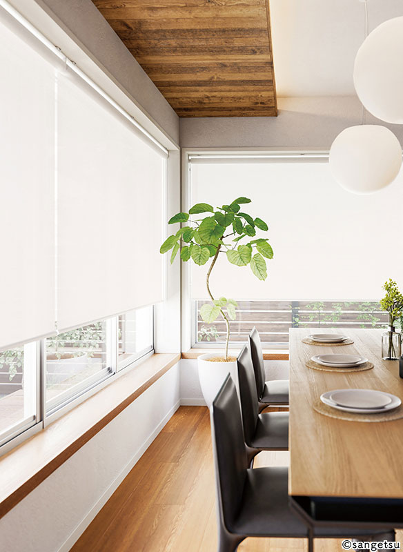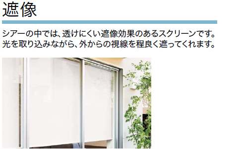 ガーゼのようなやわらかな表情のシアーです。シアーの中では透けにくい遮像効果のあるスクリーンで、光を取り込みながら外からの視線を程よく遮ってくれます。