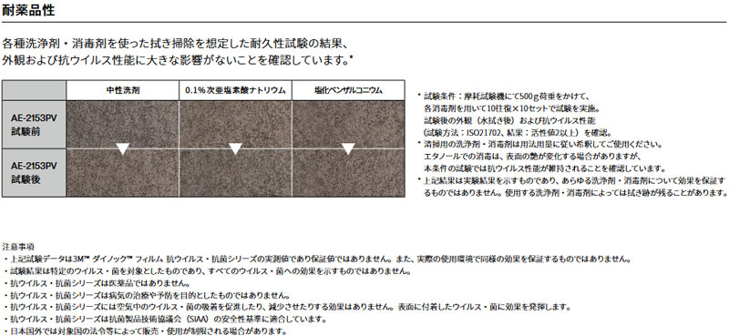 ・表面が汚れていると抗ウイルス・抗菌効果が発揮しません。日常の清掃は水拭きもしくは市販の中性洗剤をご使用ください。 消毒が必要な場合は次亜塩素酸ナトリウムもしくは塩化ベンザルコニウムを含有する消毒液をご使用ください。エタノールでの消毒は、製品の外観が変化する場合があるので推奨しません。