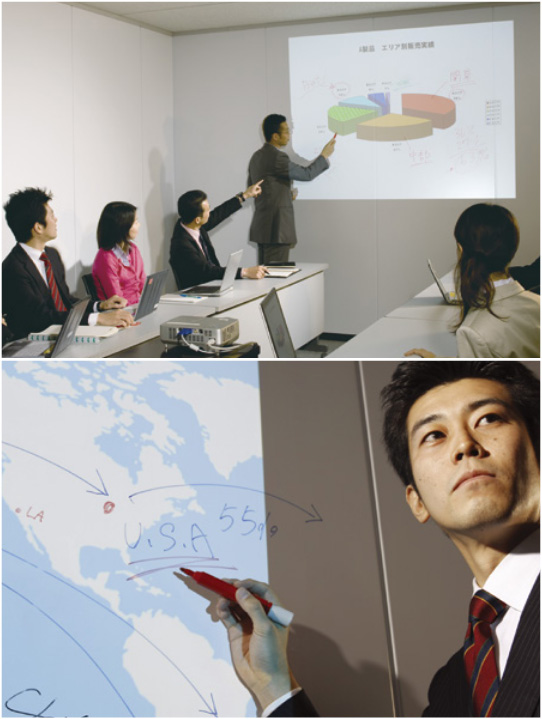 書き消しの機能に加え、プロジェクター投影のできるホワイトボードフィルムです。 スクリーン設置の手間が省け、映った映像に情報を書き加えながらのプレゼンや会 議も可 能です。