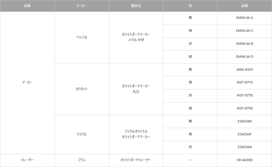・イレーザーの種類により、消去性に若干の違いが出ますので、ご了承ください。特にPWF-500は、以下に挙げる推奨イレーザーをご使用ください。メーカー:プラス 製品名:ホワイトボードイレーザー ER-44369