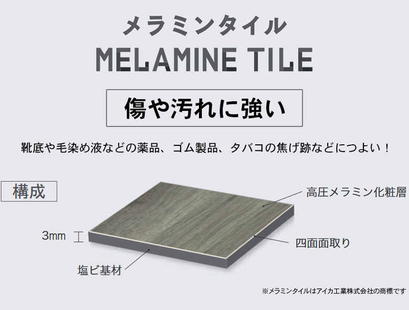 ※ メラミンタイルはアイカ工業株式会社の商標です。 ※ 自然素材が持つ木目を表現しているため、柄域によって色の濃淡に特徴があります。 ※ 施工の前に必ず施工要領を確認してください。 ※ メラミンタイルは材質が硬めです。施工前に試し切りをしてカット性等をご確認ください。 ※ メラミンと塩化ビニルの材質の違いにより、タイルに若干の癖がついていることがあります。 ※ 指定接着剤を使用し、施工後はローラー等で念入りに圧着してください。 ※ エルワイタイル取り扱い注意事項と重要警告事項(PDF ) |