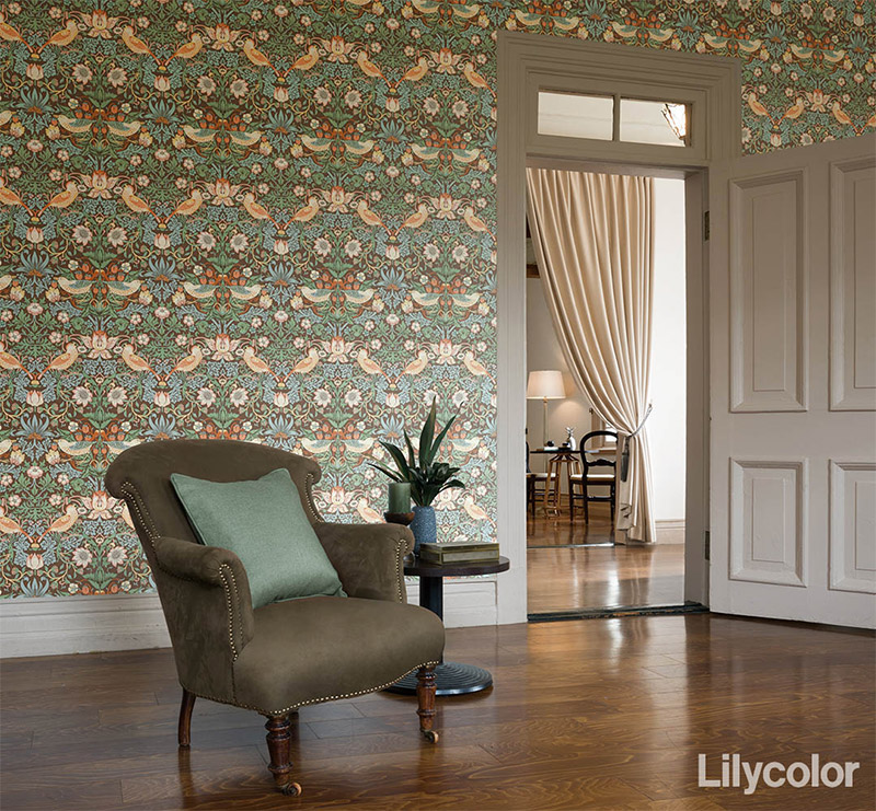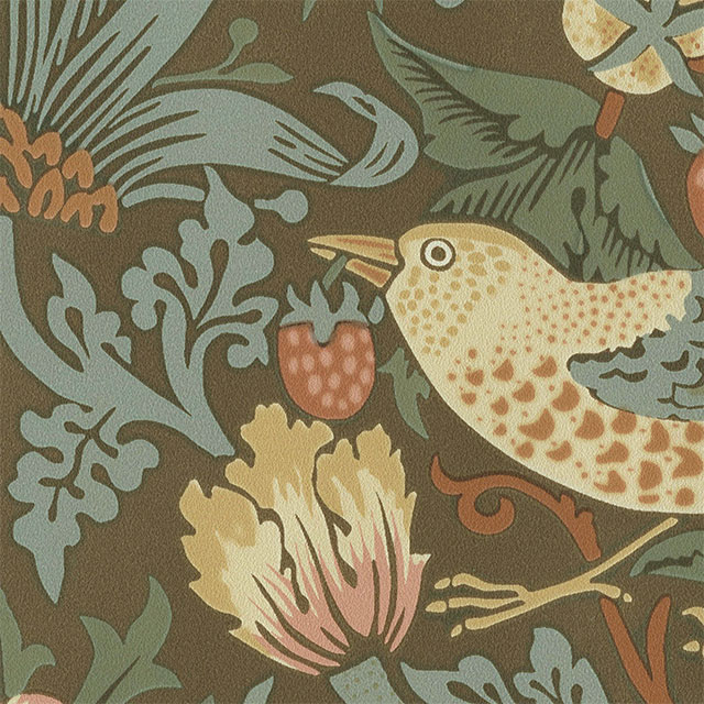 いちご泥棒は、1883年にインテリア用ファブリックとしてデザインされました。 モリスの郊外の別宅、ケルムスコット・マナーの庭のいちごを盗みにきていたツグミを描いています。当時、モリス商会で最も高価なプリント生地であったにも関わらず、お客様に最も愛される柄となりました。 そして今でも世界中の人々に愛されるアーツ・アンド・クラフツのデザインの1つです。