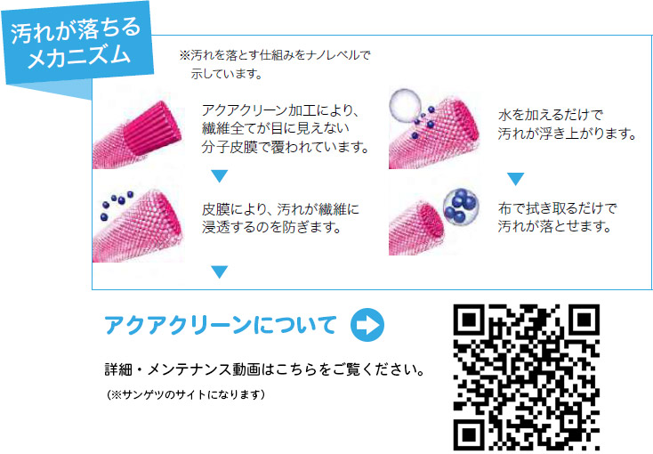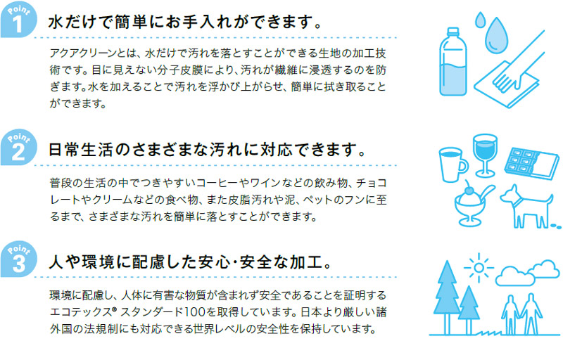 アクアクリーンは「水」だけで日常生活での汚れの多くを取り除くことができるメンテナンス性に優れた繊維加工です。