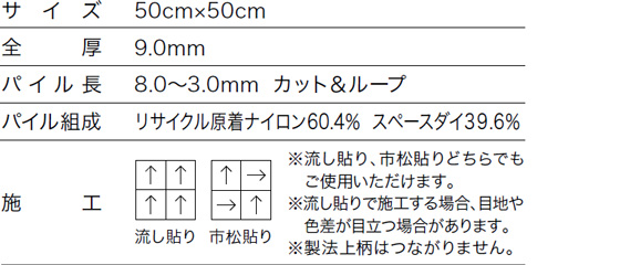 ※ 大柄を50㎝角に裁断していますので、タイル毎に柄が異なります。(特定の柄は指定できません) ※ カット部分はパイルの方向や傾斜により色差が生じます。 ※ 流し貼りで施工する場合、目地や色差が目立つ場合があります。 ※ 製法上柄はつながりません。 ↓ 資料の「選択・施工上のご注意」を必ずご確認ください。 |