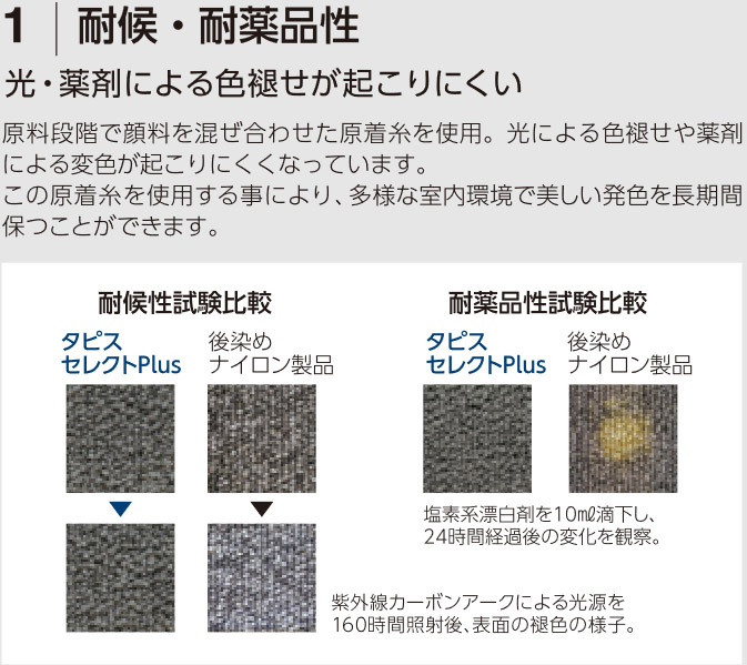 ※ 施工は市松貼りを標準とします。流し貼りは、目地が目立つ箇所ができる可能性があります。 ※ 明るい色は目地の影が目立つ場合があります。また汚れが目立ちやすい傾向があるので、ご使用上ご注意ください。 ※ 施工直後、色ムラに見えることがありますが、パイルの倒れ具合の差によるもので、時間の経過とともに解消します。 |