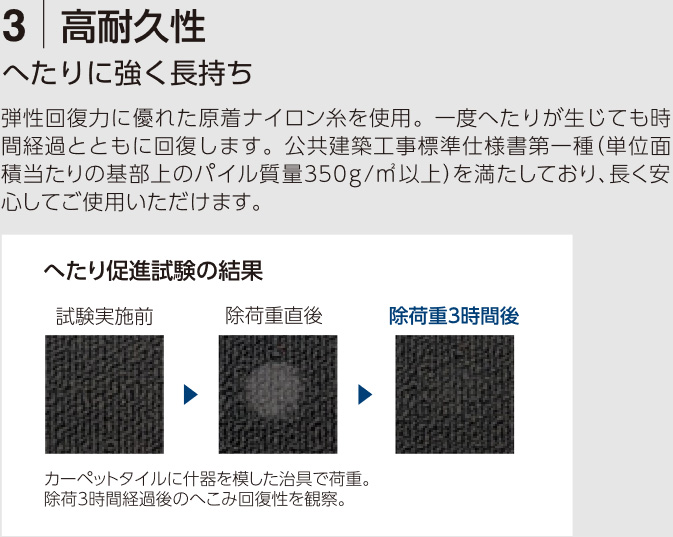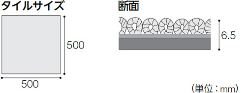サイズ : 500 × 500mm 全 厚 : 6.5mm パイル形状 : ループパイル パイル組成 : 原着ナイロンF100% バッキング : 特殊PVC+ガラス不織布(軽量化バッキング) パイル長 : 3.5mm パイル密度 : 1/10ゲージ × 10.5ステッチ 梱 包 : 16枚入 / ケース 重 量 : 17.3kg / ケース |
