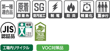 防炎性能試験番号 E1190079 帯電性:1.0kV以下(23℃ 25%RH合成底靴 / JIS L 4406) 耐光堅ろう度:5級(JIS L 4406) 摩擦堅ろう度 (乾):4級(JIS L 4406) 防汚性:フッ素系樹脂加工(SG加工) F☆☆☆☆ 認定番号 J19-31541 |