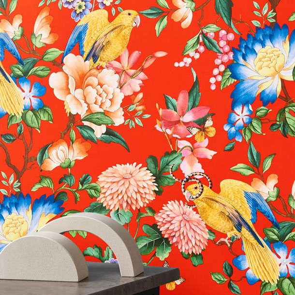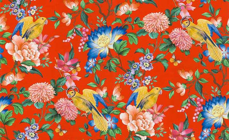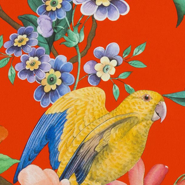 色鮮やかな鳥や蝶が戯れあう、力強さを秘めたデザイン。