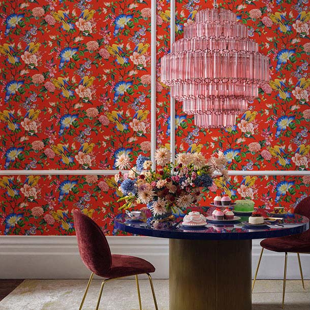 イギリスの壁紙ブランド「クラーク&クラーク」が世界的陶磁器ブランド「ウェッジウッド」の柄パターンの1つ ❝ワイルドストロベリー❞ をデザインした壁紙。