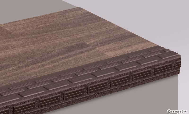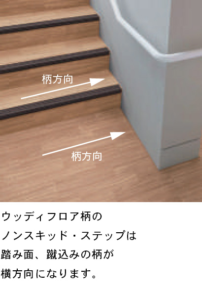 ※ ノンスキッド・ステップは踏み面、蹴込みの柄が横方向になります。 ※ ノンスキッド・ステップとノンスキッド(シート)は生産ロットが異なるため、色調が異なる場合があります。 ※ 屋上、ルーフバルコニーには施工できません。 ※ バルコニー・廊下の使用に際しては各マンション規定のルールに則りご使用ください。 |