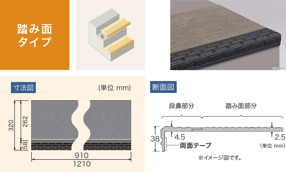 910㎜巾 × 2.5㎜厚 1,210㎜巾 × 2.5㎜厚 段鼻部 : 4.5㎜厚 踏み面タイプ:12枚入り / ケース Made in Japan 日本製