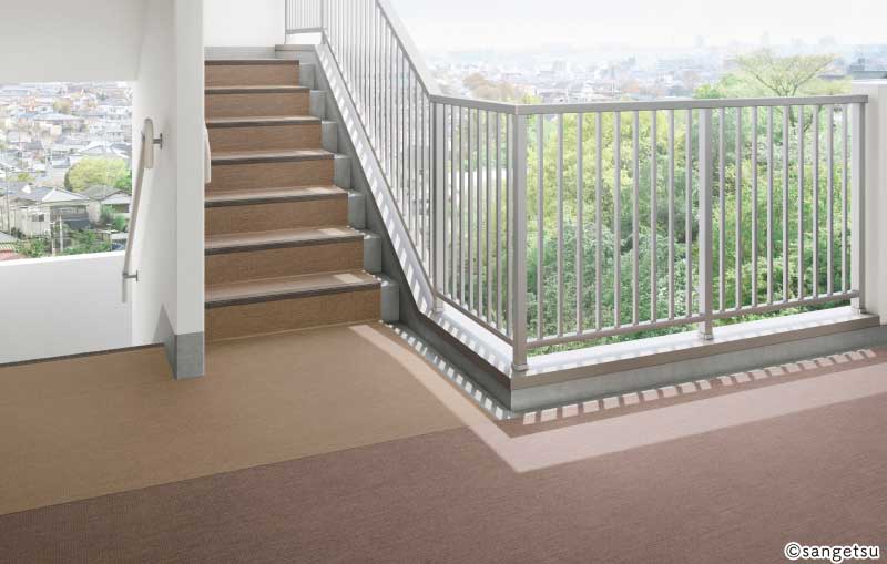 ※ ノンスキッド・ステップは踏み面、蹴込みの柄が横方向になります。 ※ ノンスキッド・ステップとノンスキッド(シート)は生産ロットが異なるため、色調が異なる場合があります。 ※ 屋上、ルーフバルコニーには施工できません。 ※ バルコニー・廊下の使用に際しては各マンション規定のルールに則りご使用ください。 |