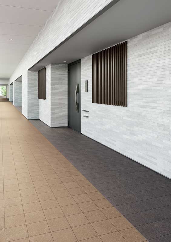 約15cm角のスタンダードな石目タイル柄。穏やかな抑揚があり、マンションのアルコーブやポーチなどにおすすめです。