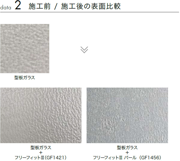 ※ 型板ガラスの凹凸面に施工した場合、細かい気泡が残ります。 ※ 施工前と比較して、ガラス面が白濁して見える場合があります。 ※ 水を使用しないドライ施工の商品です。 ガラスフィルムの施工方法をご確認ください。 ※ 強化型板ガラスへの施工はおすすめしません。美観を損なう場合があります。 ※ フリーフィットⅢ パール(GF1456)はパールインキを使用しており、室内から見た場合、室内側の照明などの光を反射します。 |