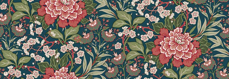 リンジー ・P・バターフィールドのエレガントなデザインには、極東の美学からインスピレーションを得た繊細な美しさがある牡丹や梅が描かれており、室内にいながら自然の素晴らしさを感じさせてくれます。自然界とモリスの芸術的ビジョンから影響を受けている彼の壁紙とテキスタイルはヴィクトリア朝後期からエドワード朝初期の頃、ファッショナブルなインテリアとして大変人気がありました。